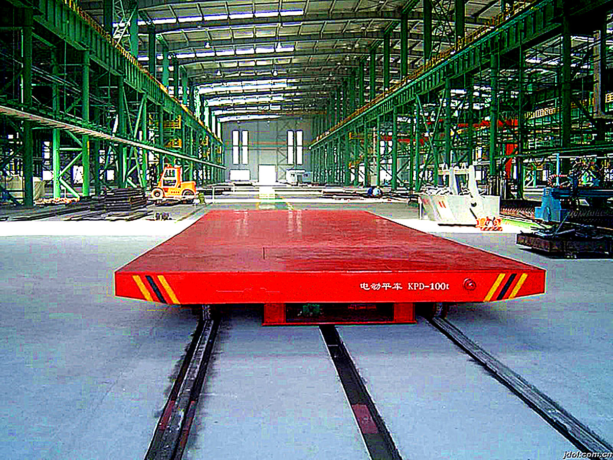 電動平車,又稱電動平板車、電平車、臺車、過跨車、地爬車等,是一種廠內(nèi)有軌電動運輸車輛,首先它是一種軌道型運輸車輛,需要在地面上鋪設軌道,軌道一般為工字型面接觸道軌;其次它是電驅(qū)動車輛,在電機減速機驅(qū)動下自動運行,再次它是一種平板車,臺面平整無廂蓋,特殊情況下也可以是非平面但無廂蓋,車體無方向盤只有前進后退方向(即使轉(zhuǎn)彎也城靠軌道轉(zhuǎn)彎)。此種車輛具有結(jié)構(gòu)簡單、使用方便、承載能力大、不怕臟不怕砸、維護容易、使用壽命長等特點,因其方便、壯實、經(jīng)濟、實用、易清理等,成為企業(yè)廠房內(nèi)部及廠房與廠房之間短距離定點頻繁運載重物的運輸工具。